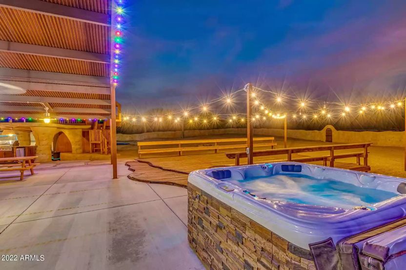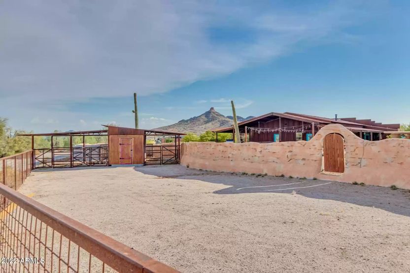 “There is a full casita being used as a pool house that has a bedroom, bathroom, and living area,” Spaid adds. The lot also features a tack room with two stalls and a corral as well as lots of garage and storage space, along with RV hookups.