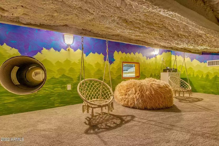 “There’s this tunnel that leads to secret rooms,” Spaid notes. “You can go up a spiral staircase to a loft, then crawl through a door, and there is this little area with a vaulted ceiling that they had as a hangout area. The big tunnel you can crawl through (from the swing room), and I have had plenty of adults go through it to check it out. You can climb a rock wall that also leads to a secret room.”