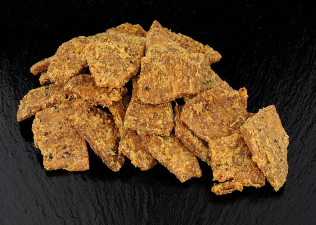 Plant jerky on a black slate board.